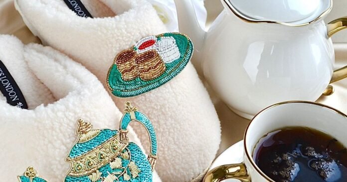 Crafted by Laines London, these slippers showcase the brand’s intricate beaded designs. Juliet’s creative touch added an afternoon tea theme to the collection, featuring charming motifs like teapots, cakes, and biscuits.